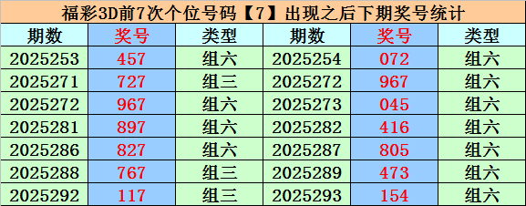 个位分析:上期个位开出奖号7,个位历史上号码7已开出856次,最近100期个位号码开出7次,上期号码遗漏3期出现。