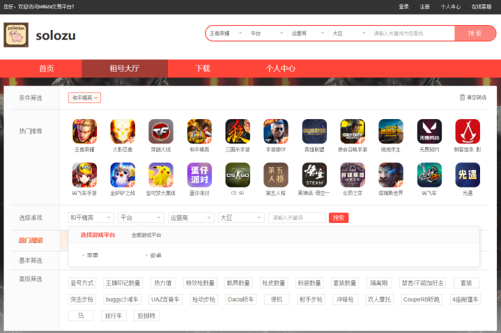 solozu平台是近两年新兴的租号平台,在游戏玩家间的口碑也比较好,就在今年8月,solozu平台还在各大手机应用市场里上架了官方APP,使手游玩家的租号变得更加便利快捷。