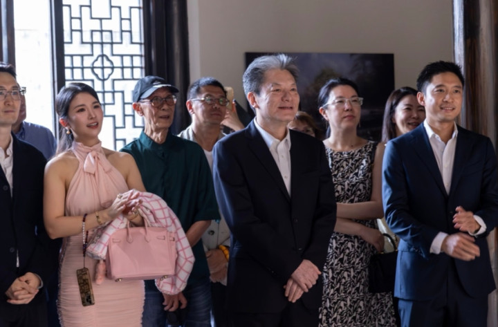 此次朱玲玲的摄影展,他更是恩爱相伴。只见他一头银发,内穿一件白色衬衫,外搭黑色中式外套,下搭黑色裤子,看起来文质彬彬。