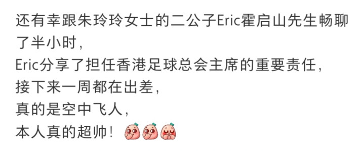 除了爱人,二儿子霍启山也现身支持朱玲玲。霍启山身穿白色衬衫,搭配蓝色西装,长相帅气,看起来比实际年龄显年轻。那一刻,感觉贵公子具象化了。