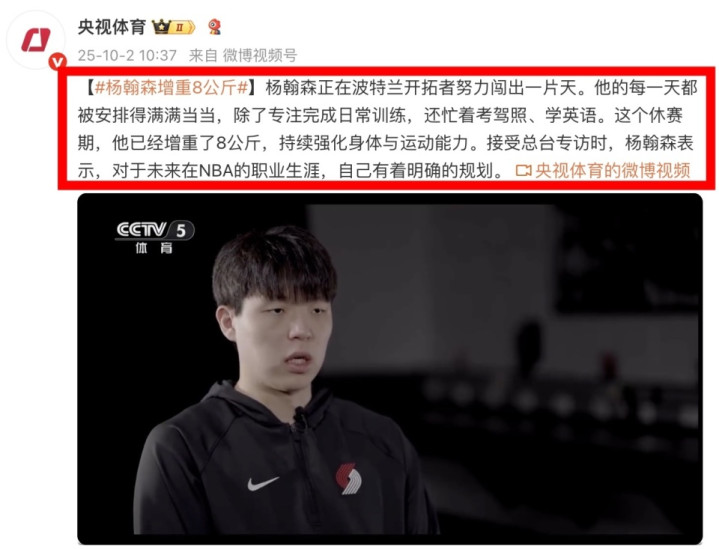 在央视的采访中,杨瀚森也向国内球迷分享了他登陆NBA后的生活与心态。他表示,来到波特兰这座新城市后,一切都进行得很顺利。在专注于日常训练的同时,他还在忙着考取驾照和学习英语,以尽快适应在美国的生活与比赛节奏,尤其是在场上,他需要用更流利的英语与队友进行沟通。对于自己的NBA生涯,这位年轻人也展现出了清晰的头脑,他表示自己有着明确的规划,当下的目标就是要珍惜所有的上场时间,打好每一分钟。这种不骄不躁、脚踏实地的态度,让关心他的球迷们感到十分欣慰,也对他在新赛季的前景增添了更多的信心。(信息源:@央视体育)