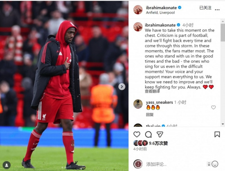利物浦中卫科纳特社媒写道:“我们必须坦然面对此刻的困境,批评是足球的一部分,但我们每次都会奋起反击,最终渡过这场风暴。”